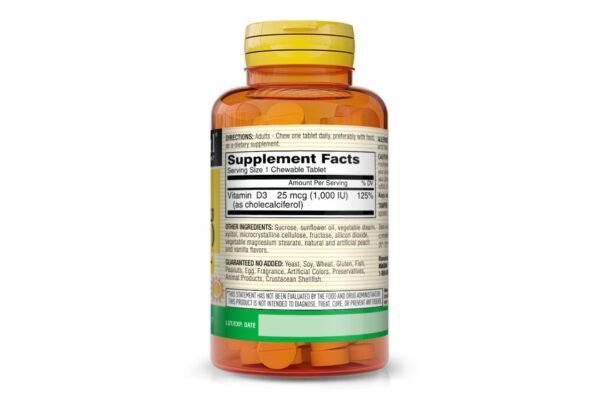 D3 1000 IU (25 mcg) Chewable Tablets provide an enjoyable and effective way to maintain adequate vitamin D levels and support overall health.