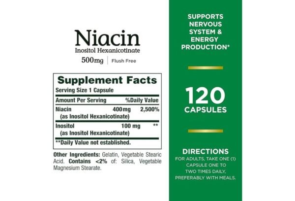 • Key Ingredient: Niacin (Vitamin B3) 500mg per capsule.